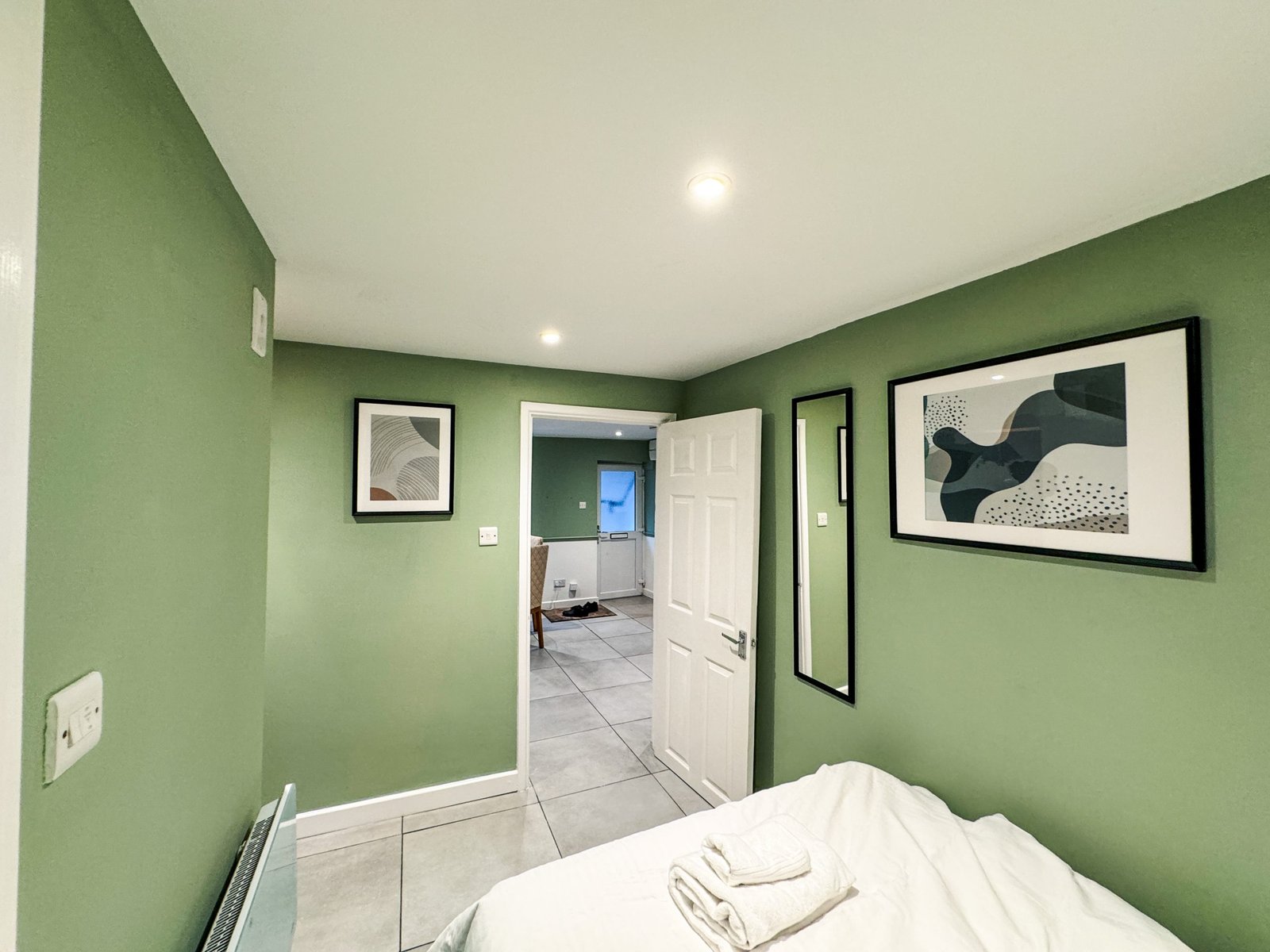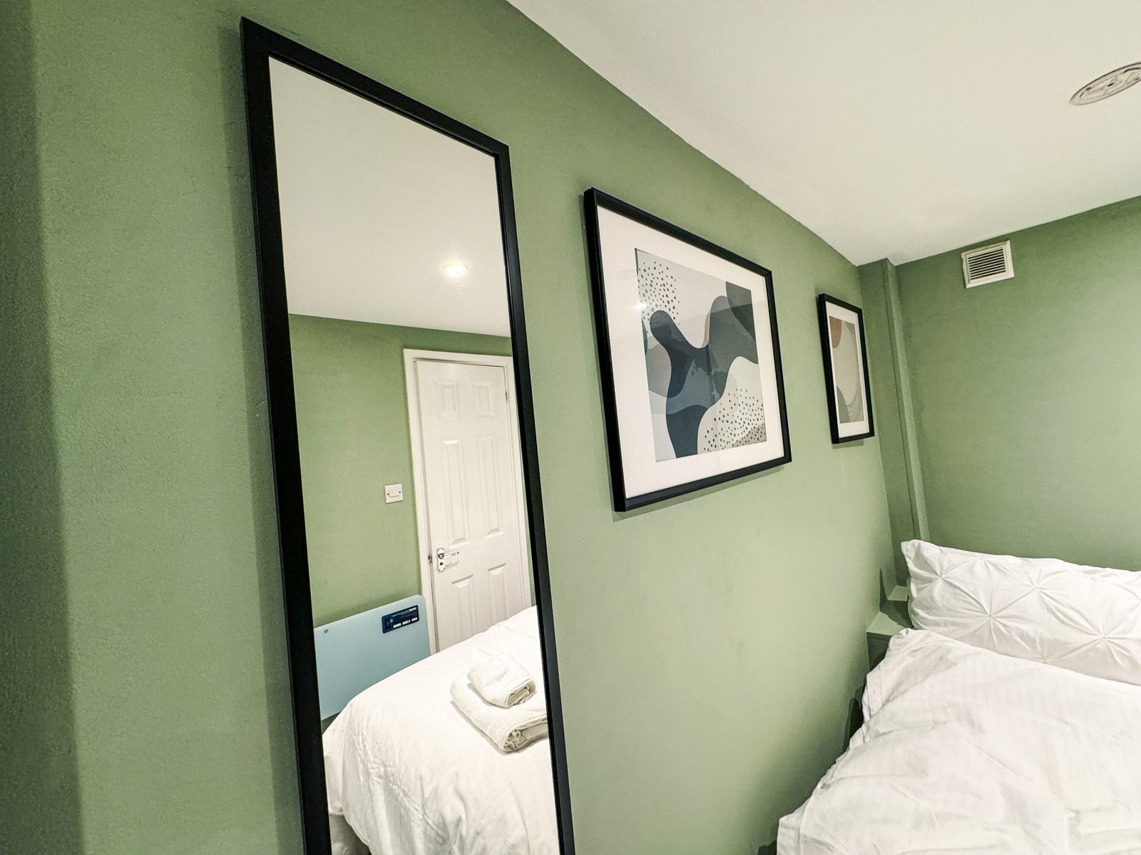 A newly refurbished one bedroom apartment with a stylish serene sage green, white colour scheme, blending modern sophistication with cozy warmth. Enjoy ample amenities: a well equipped kitchen, comfortable bedrooms, high-speed internet, and a peaceful area for relaxation. Ideal for both leisure and work, it promises to a unique and memorable stay in luxurious comfort. This space caters perfectly for Contractors, Business professionals, Families on vacation or international travelers visiting London for a special event. This apartment also features a 58 Inch Smart 4K Widescreen TV for your viewing pleasure making this apartment an experience of rest and pleasure.